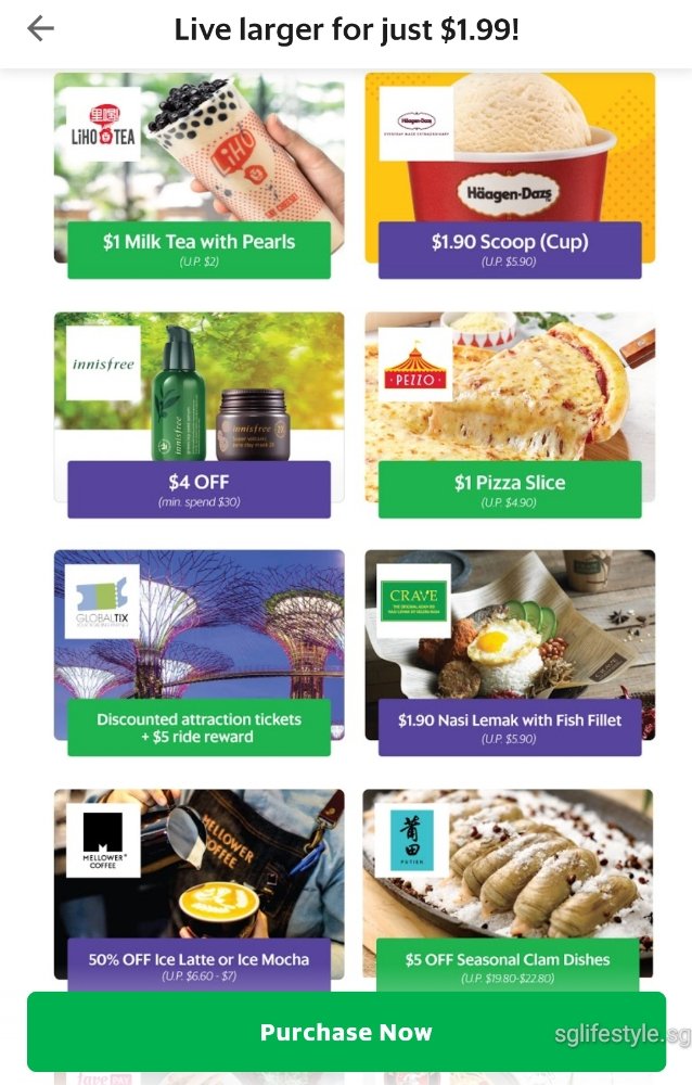 - Purchase the GrabPay “Live Larger” plan on the Grab app for $1.99 via GrabPay Credits