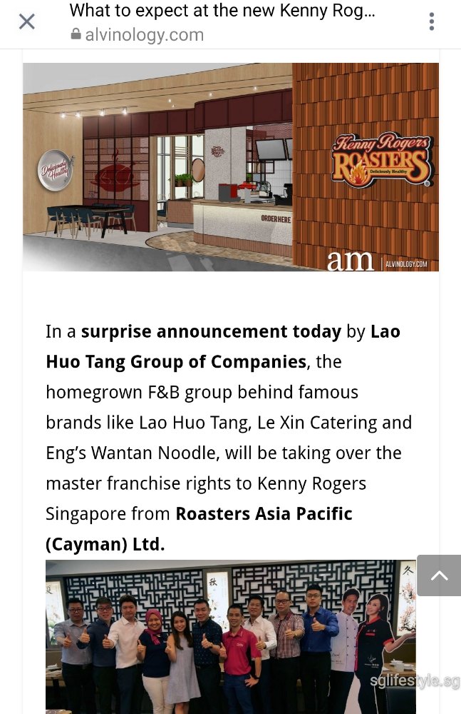 In a surprise announcement today by Lao Huo Tang Group of Companies, the homegrown F&B group behind famous brands like Lao Huo Tang, Le Xin Catering and Eng’s Wantan Noodle, will be taking over the master franchise rights to Kenny Rogers Singapore from Roasters Asia Pacific (Cayman) Ltd. – Alvinology