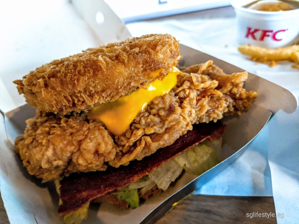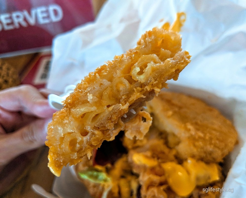 A succulent piece of Zinger (fried chicken breast) chicken sandwiched between a slice of turkey bacon, lettuce, more cheese sauce and TWO fried Mac N Cheese Patties!